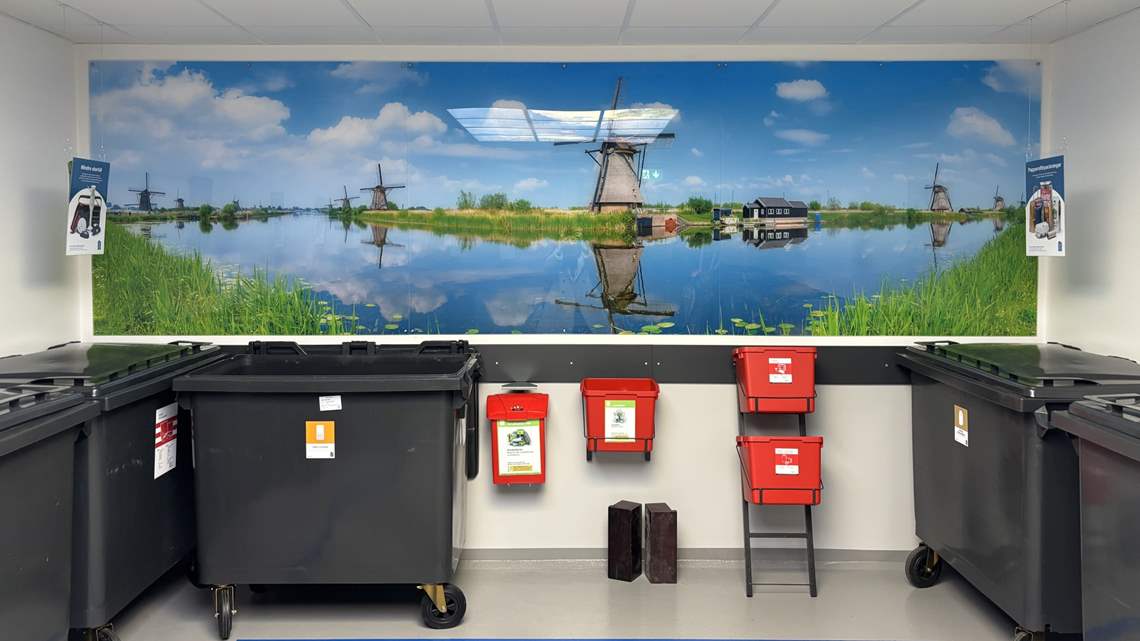 De betonggrå väggarna i avfallsrummen målades i mer harmoniska nyanser, och i båda rummen sattes en vacker fondtapet med väderkvarnar upp. I taket placerades takfönsterlampor för att ge illusionen av en himmel och skapa en känsla av dagsljus.