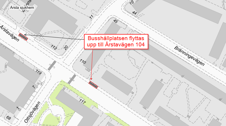 Busshållplatsen är planerad att flyttas cirka 100 meter mot Årsta torg i slutet av oktober, se kartbild nedan.