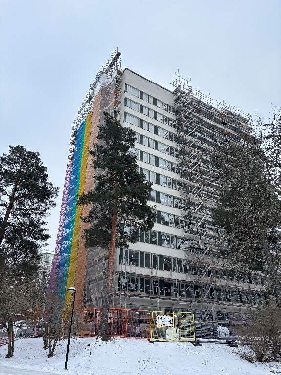 I hus A har plan 17, 18 och 19 besiktats med föredömligt resultat. De sista fönstren i hus A monteras, och i hus B sågas det upp öppningar för nya. Vi låter den gamla parketten i gemensamhetslokalen ligga kvar eftersom den ska återbrukas.