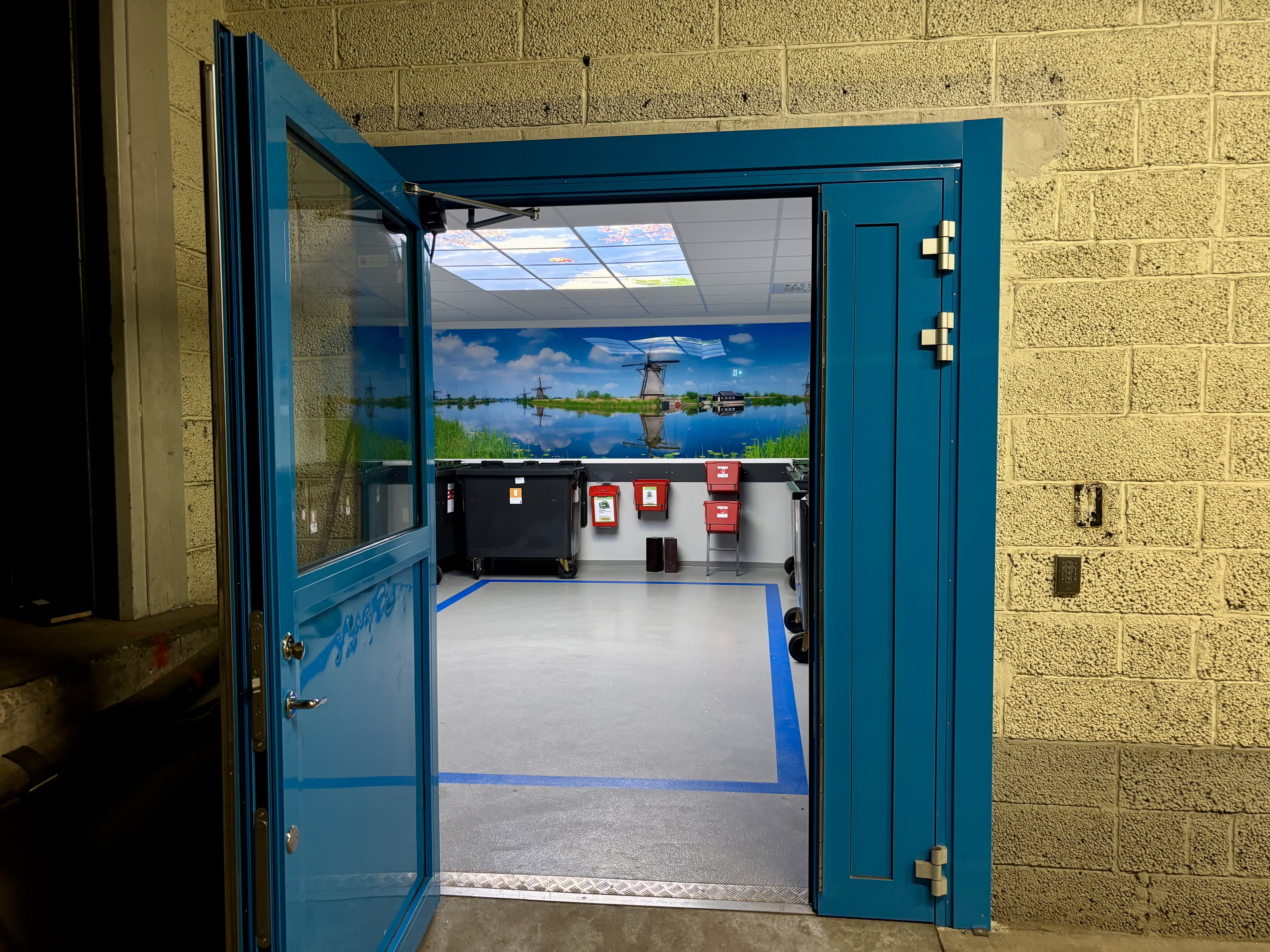 De betonggrå väggarna i avfallsrummen målades i mer harmoniska nyanser, och i båda rummen sattes en vacker fondtapet med väderkvarnar upp. I taket placerades takfönsterlampor för att ge illusionen av en himmel och skapa en känsla av dagsljus.